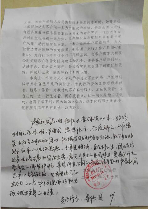 在客流量較多時(shí)地能主動(dòng)鋪助大堂經(jīng)理完成客戶的分流和引導(dǎo)工作,當(dāng)有年紀(jì)較大或是攜帶較多物品的客戶時(shí),她都主動(dòng)上前幫助這些客戶做一些力所能及的事情,特別是團(tuán)山有很多拿著社??ㄐ枰∩绫YY金的老年客戶,這些老年客戶對(duì)自主柜員機(jī)一無(wú)所知,因盧姐服務(wù)態(tài)度好只要有老年客戶來(lái)都主動(dòng)找她幫忙支取,一米二去跟吝戶都很熟絡(luò),為大堂營(yíng)造其樂融融的良好氛圍,都夸團(tuán)山支行工作人員細(xì)心有耐心,為我行下鄉(xiāng)走訪也打下良好基礎(chǔ)。當(dāng)客戶攜帶大額現(xiàn)金時(shí)提醒客戶保管好隨身物品和現(xiàn)金、并將客戶送到門口送進(jìn)車內(nèi),日送客戶離開;每當(dāng)有客戶東西落下時(shí)都仔細(xì)收好,并做好記錄,隨時(shí)等待客戶的認(rèn)領(lǐng)